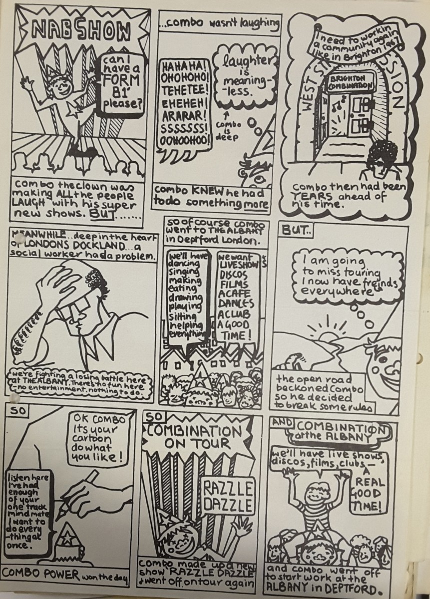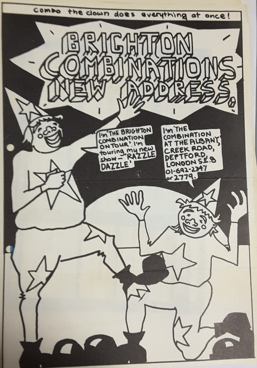I invented the name Albany Empire for the Albany Hall. I hoped the name would borrow some of the roots of the New Cross Empire the local music hall which had closed in the sixties. It maybe that we dropped the name Brighton Combination in 1971. We did move from Brighton to Deptford around then. But when our publicity material did change we used the name Combination on Tour. Later the Combination at the Albany Empire. Jenny and I left the company in 1985, but the company with Marcel Steiner on the board still called itself the Combination till 1990.’