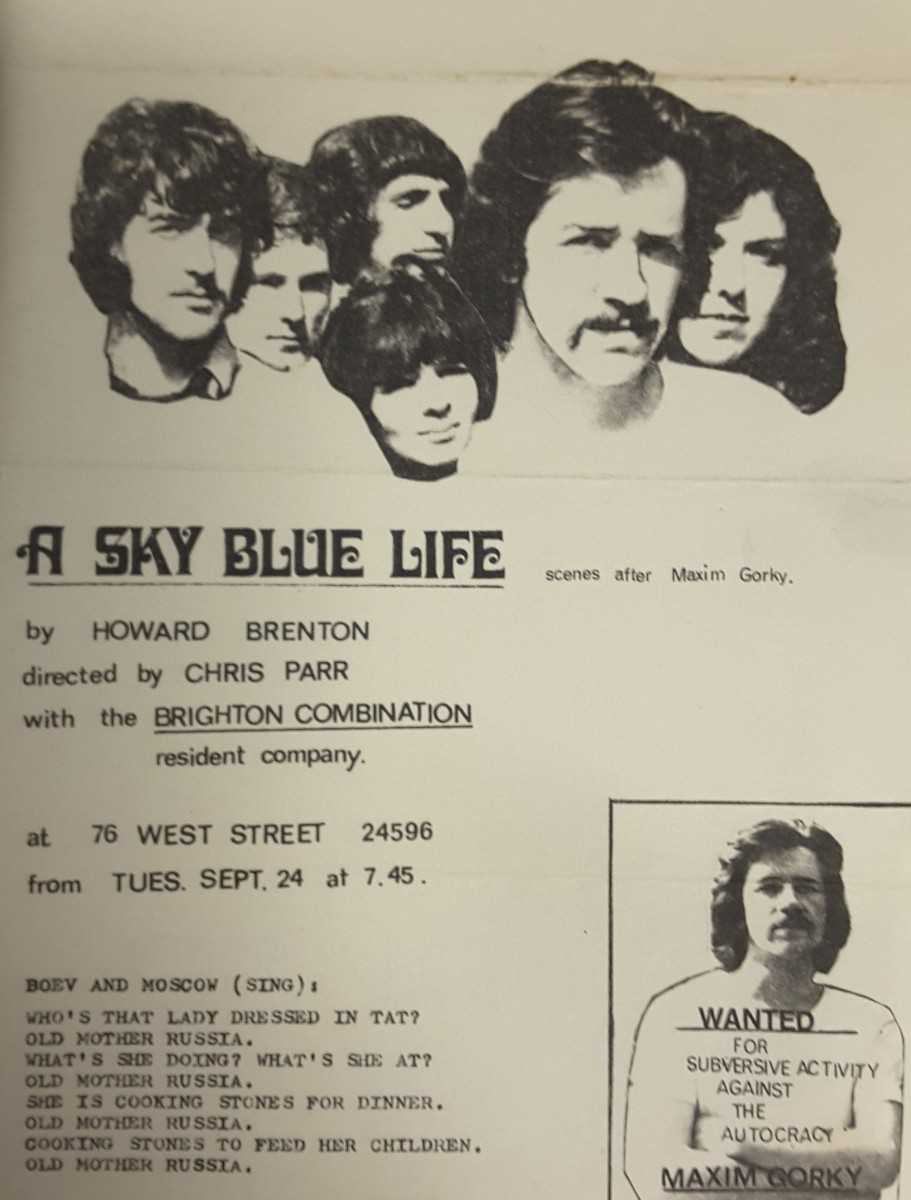 Combination members included Elyse Dodgson, Katya Benjamin, John Turner, Richard Crane, Chris Parr, John Grillo, Tim Davies, Johnny Dodgson, Katie Heyland, Jim Carter and Howard Brenton, who became their resident playwright thanks to some Arts Council funding.