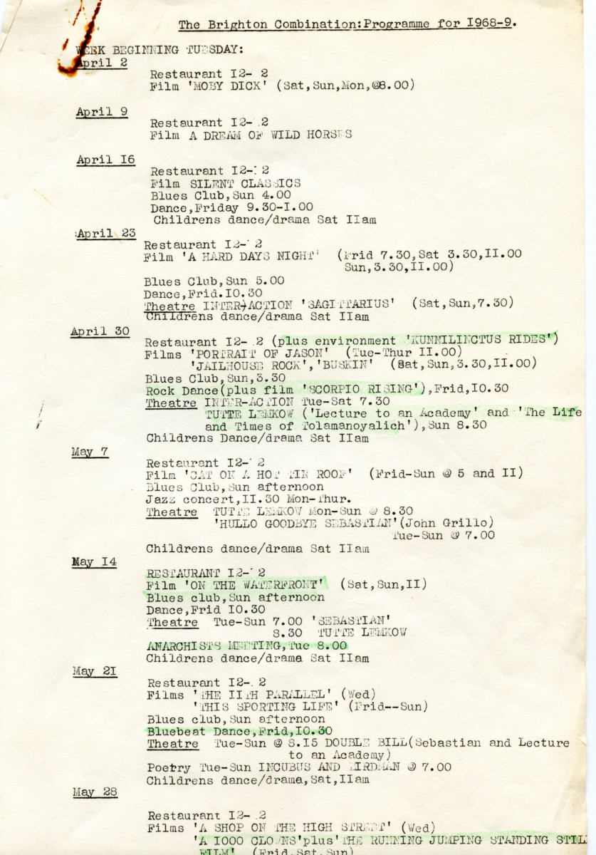 Noel Greig:‘There were two friends of mine at university, two women friends of mine, one called Ruth Marks and a woman called Jenny Harris. And they’d been up to Edinburgh, to the Edinburgh Festivals and seen some of the stuff that was going on in Edinburgh which was happening ’65 – ’66. You know, the Traverse and the Happenings… and they were very excited about that. And we had had conversations about wouldn’t it be interesting if we just did something of our own. And we’d had sort of conversations like that at university, but in a very sort of unformed way. And then while I was actually up in Harrogate and Oldham [in rep] things were beginning to happen a bit more in London and places. And we’d had more of these conversations, and then that year we decided that we’d set up something of our own, and we moved to Brighton at the end of 1967. We’d found this old Victorian school house just off West Street just before the promenade, up a little alley. And we sort of got it for a peppercorn rent. A little Victorian school house and some outhouses, and we turned it into – we called it the Brighton Combination – we turned it into an Arts Lab on nothing. We converted this building. We had a room that was going to be the theatre, quite a large room, and we had small rooms with other things happening, but we had a cafe and that’s where we made our money…You’d go in in the morning, early, you’d prepare all the food, you’d cook all the food, you’d go and rehearse, and then those people who weren’t in the play would be serving the food in the evening, you’d do the play. Oh! that was the other thing about the space, we re-configured all the time, we didn’t turn it into a conventional theatre, it was a black box, it was one of the first black boxes. It changed all the time, we did different things with it. Then we’d do the play and then move everything around and we’d show a film, we had an old projector and we’d show films, radical films, and then that’s finish and we’d turn it into a dance space, and have light shows. This would go on ’til 3 in the morning, we’d have a few joints, go to bed, get up the next day and do it all again!’ (Unfinished Histories interviews 2008)