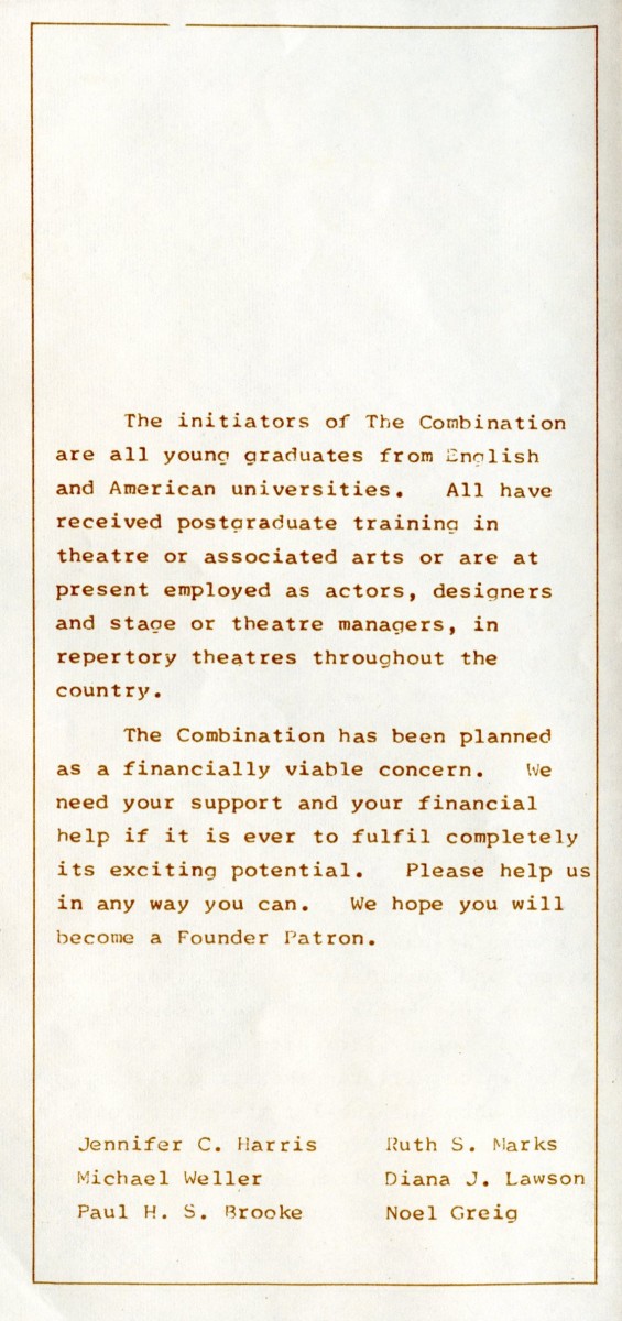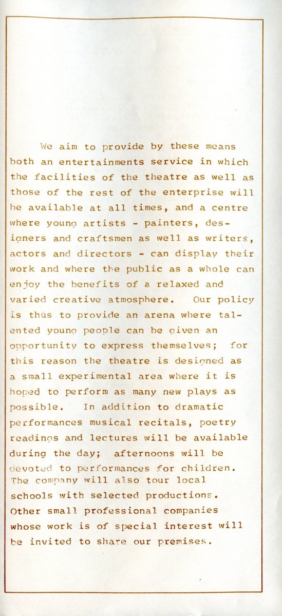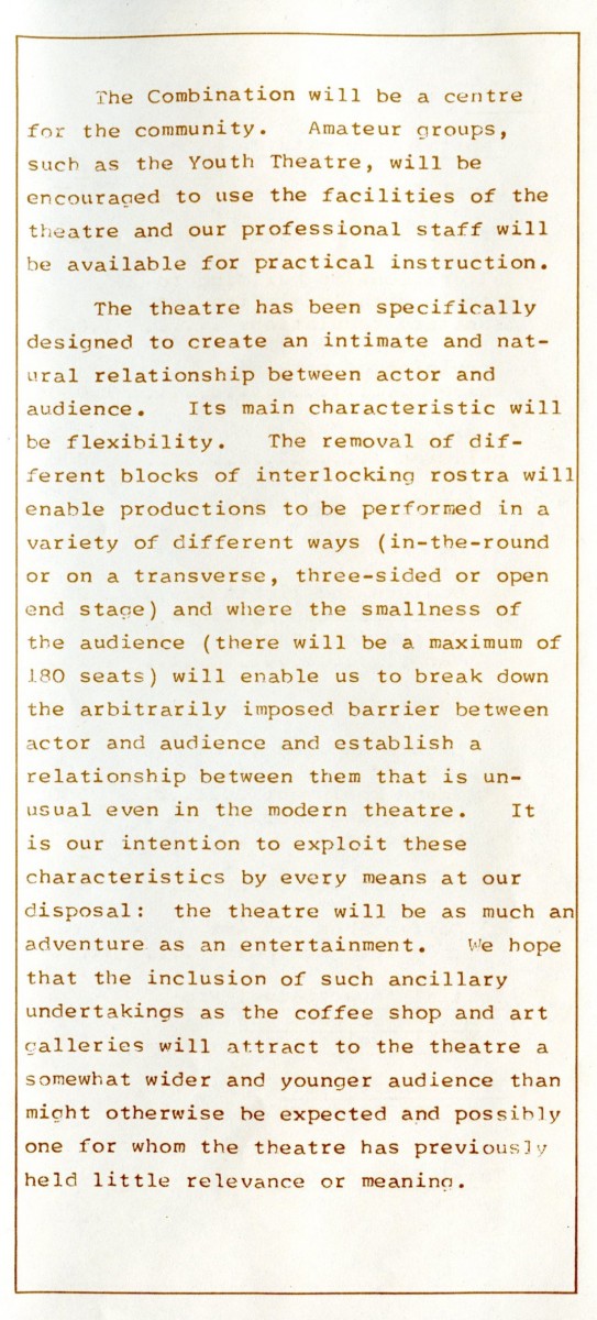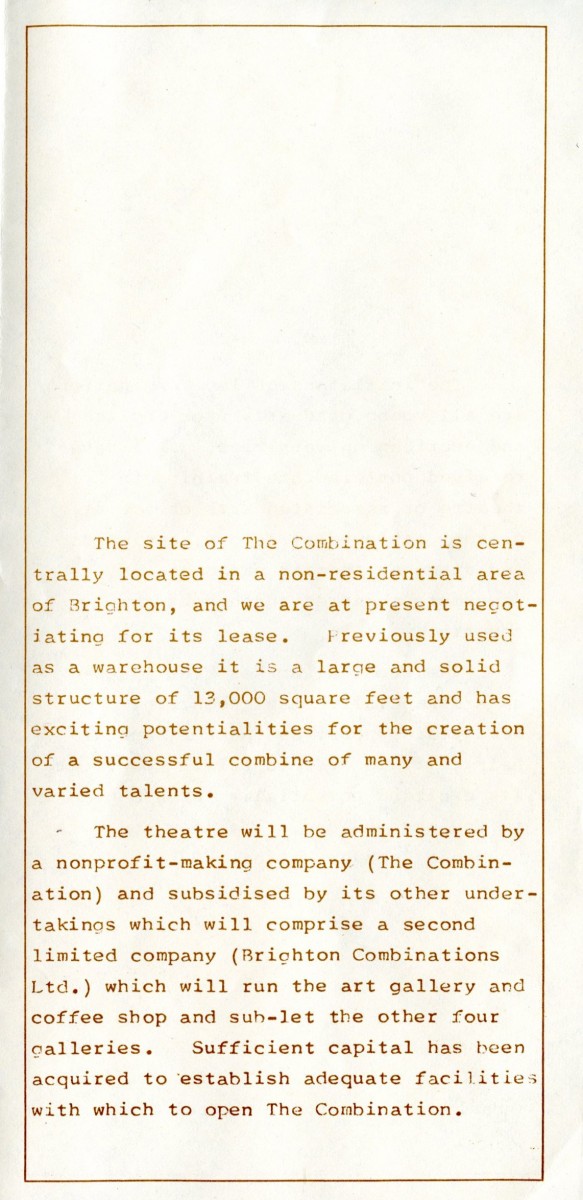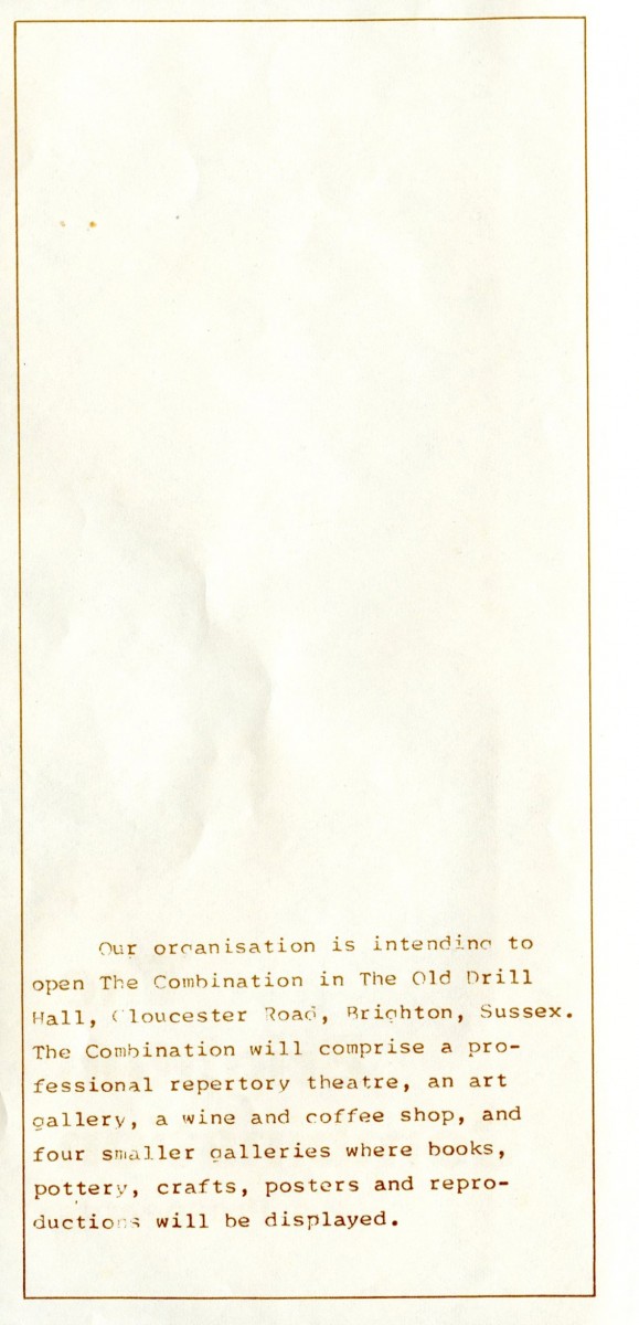 Policy: ‘The theatre will be administrated by a non-profit-making company (The Combination) and subsidised by its other under-takings which will comprise a second limited company (Brighton Combination Limited) which will run the art gallery and coffee shop and sub-let the other four galleries.’ (Brighton Combination Prospectus 1968)